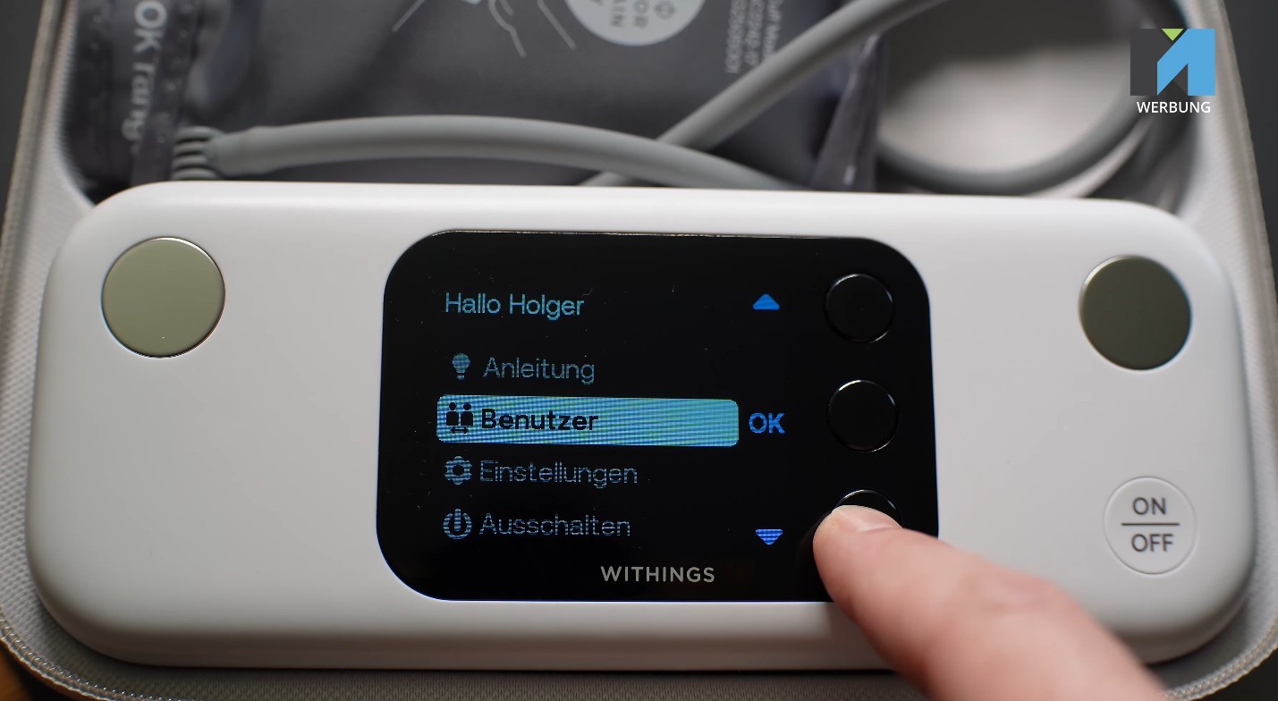 Ansonsten wird kein Smartphone für die Messung benötigt und Rätsel werden ebenfalls keine aufgegeben. Man schaltet das Gerät über die Ein/Aus-Taste ein, wählt mit den Pfeiltasten seinen Namen aus und drückt OK. Nun kann man mit den Pfeiltasten auswählen ob man eine einzelne oder eine dreifache Messung machen möchte, und drückt erneut OK. Fertig.